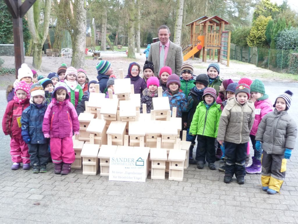 Im Februar bekamen wir von der Firma Sander Immobilen aus Leer Vogelhäuser geschenkt, die diese extra für uns hatten anfertigen lassen. Die schicken Häuser mussten von uns natürlich noch entsprechend gestaltet werden, weil das Holz nackt war und auch nicht so schön aussah.