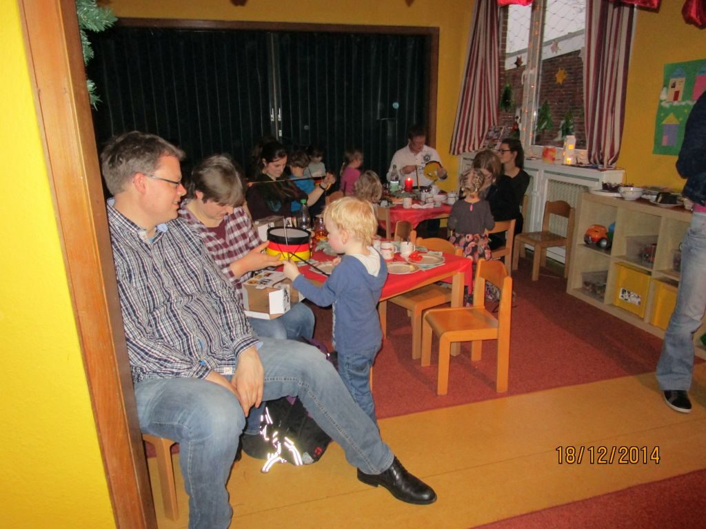 Am 18.12.14 waren wir Wichtel zusammen mit unseren Eltern zur Weihnachtsfeier im Kindergarten eingeladen. Dort ließen wir uns die leckeren Sachen vom selbstgemachten Buffet schmecken und bastelten gemeinsam mit den Eltern einen schönen Weihnachtsengel. Sogar der Weihnachtsmann hatte uns an diesem Tag nicht vergessen und brachte uns ein tolles Geschenk.